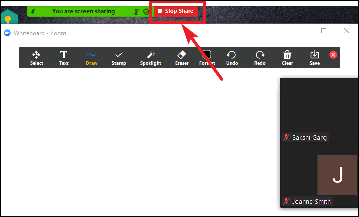 The whiteboard will open instantly and everyone in the meeting will be able to see it on their screens. You can also see the meeting participants in a minimized window while using the whiteboard. You can move the minimized meeting window anywhere on the screen. Click on ‘Stop Share’ to end the whiteboard sharing.