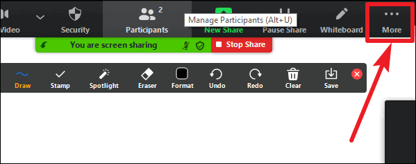 One of the most innovative features Zoom whiteboard offers is that you can even see the name of the participant next to what they wrote or drew on the whiteboard. To enable this feature, go to the top edge of your desktop screen. The meeting toolbar will appear on the screen. Click on the ‘More’ option.