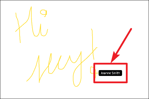 As long as this option is enabled, every doodle on the whiteboard will show the name of the participant who contributed it. The names disappear after an initial couple of seconds. You can disable it the same way at any time during the meeting.