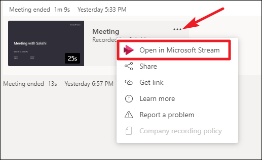 Go to the recording in Microsoft Teams (as instructed above) and click on the ‘More’ option (three-dot menu) next to it. Then, select ‘Open in Microsoft Stream’ from the pop-up menu.