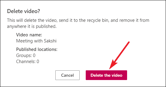 A dialog box will appear asking you to confirm whether you want to delete the video and informing you that doing so would also delete the video from where it might be published, i.e. any group or channel. Click on ‘Delete the video’ to confirm. The recording will be moved to the recycle bin.
