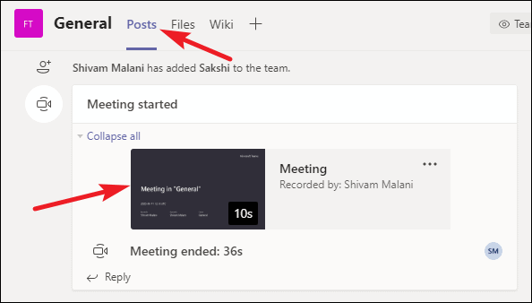 The meeting recording will appear in the ‘Posts’ tab of the channel under the Meeting started post. Click on the recording thumbnail to play it.