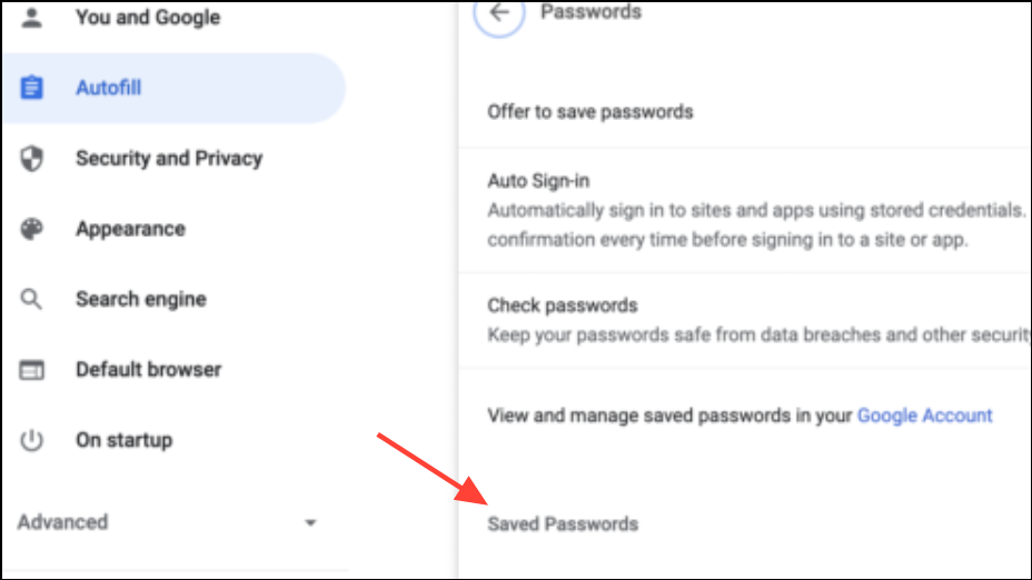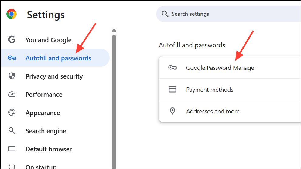 Step 3: On the left sidebar, click Autofill and passwords, then choose Google Password Manager. This section displays all credentials Chrome has saved for websites and apps.