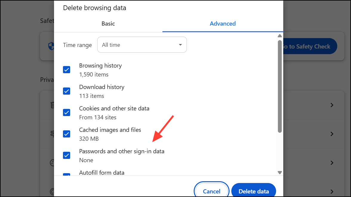 Step 3: To bulk-delete passwords, go to Settings > Privacy and security > Delete browsing data, then select Passwords and other sign-in data before confirming deletion. This action cannot be reversed.