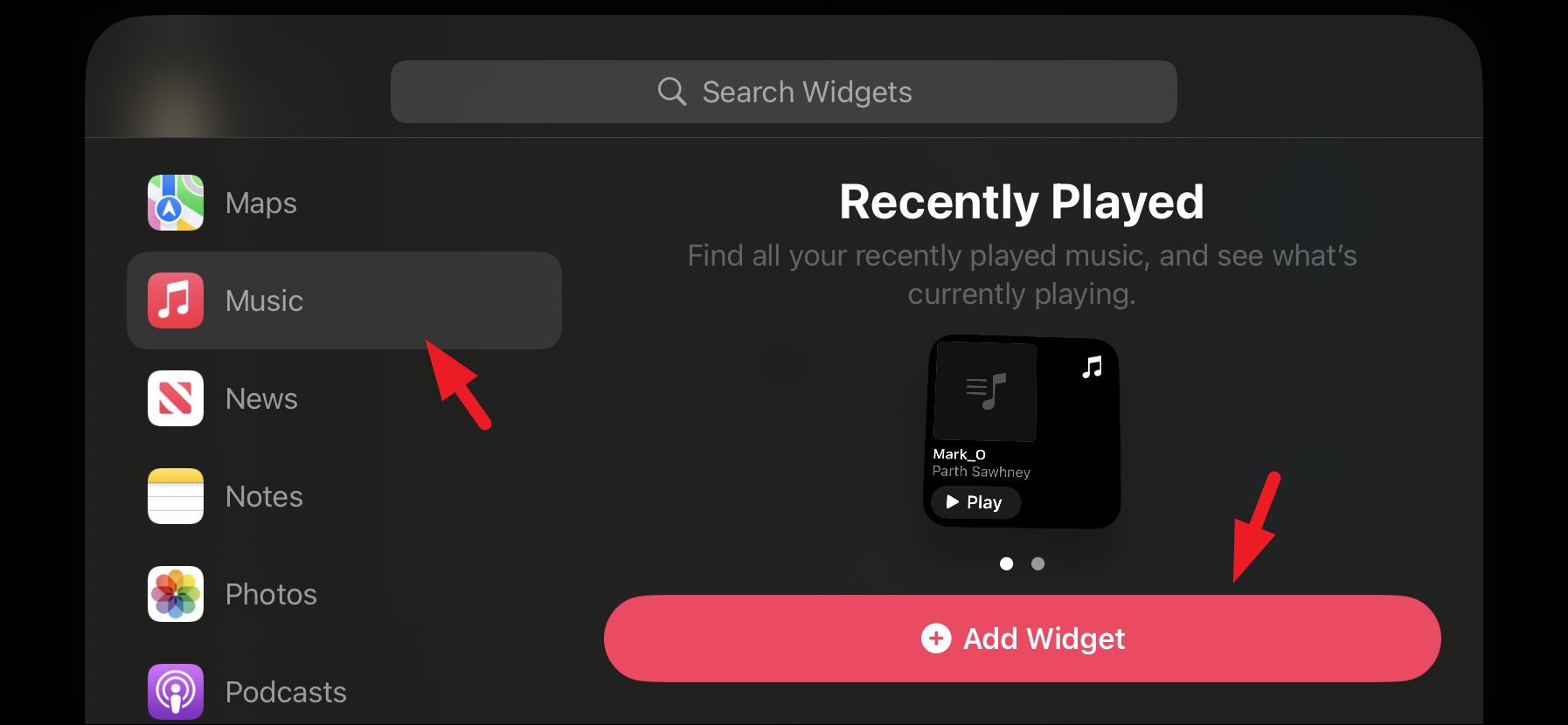 Search for or select the 'Music' app widget from the sidebar and tap 'Add widget' to include it in your StandBy Smart Stack.