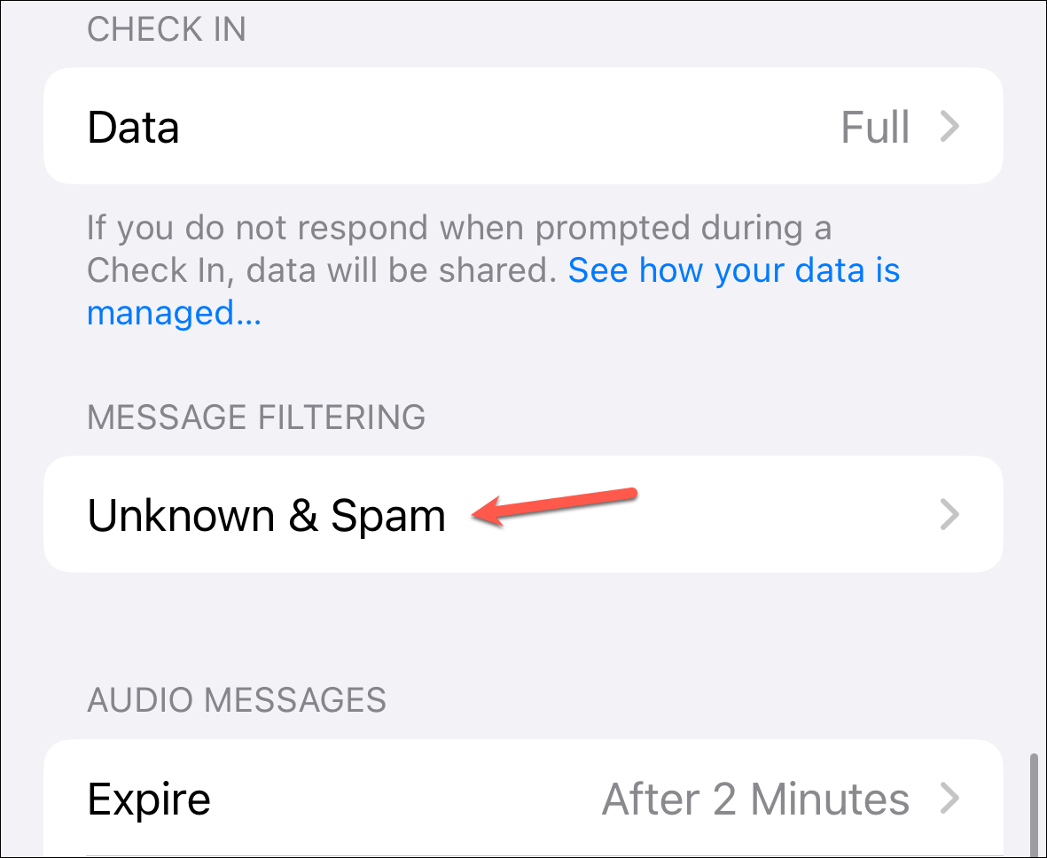 - In the Message settings, scroll down again and navigate to 'Unknown & Spam'.