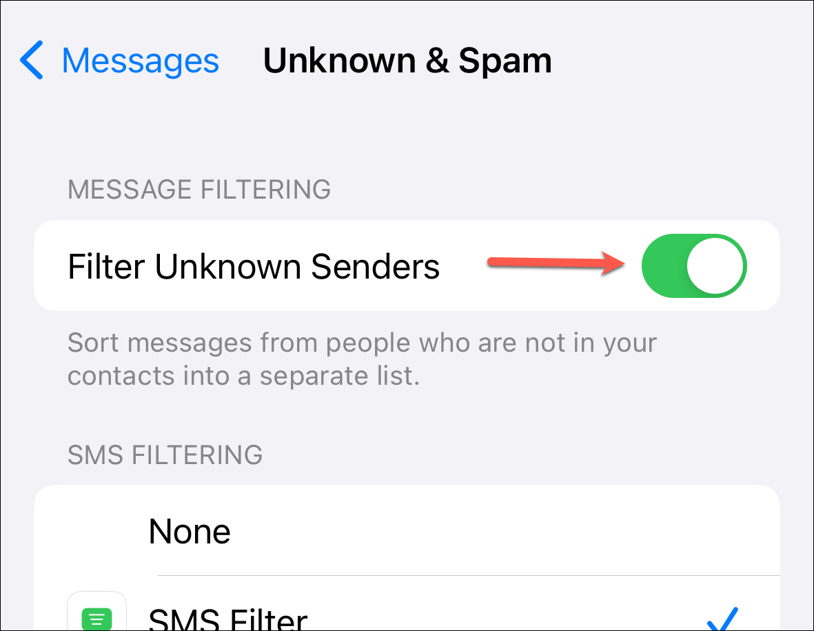 - Then, turn on the toggle for 'Filter Unknown Senders' to enable the setting.