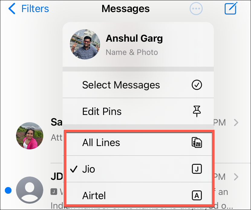- You'll see three options: 'All Lines' and two individual SIMs. Select the SIM for which you want to view the messages.