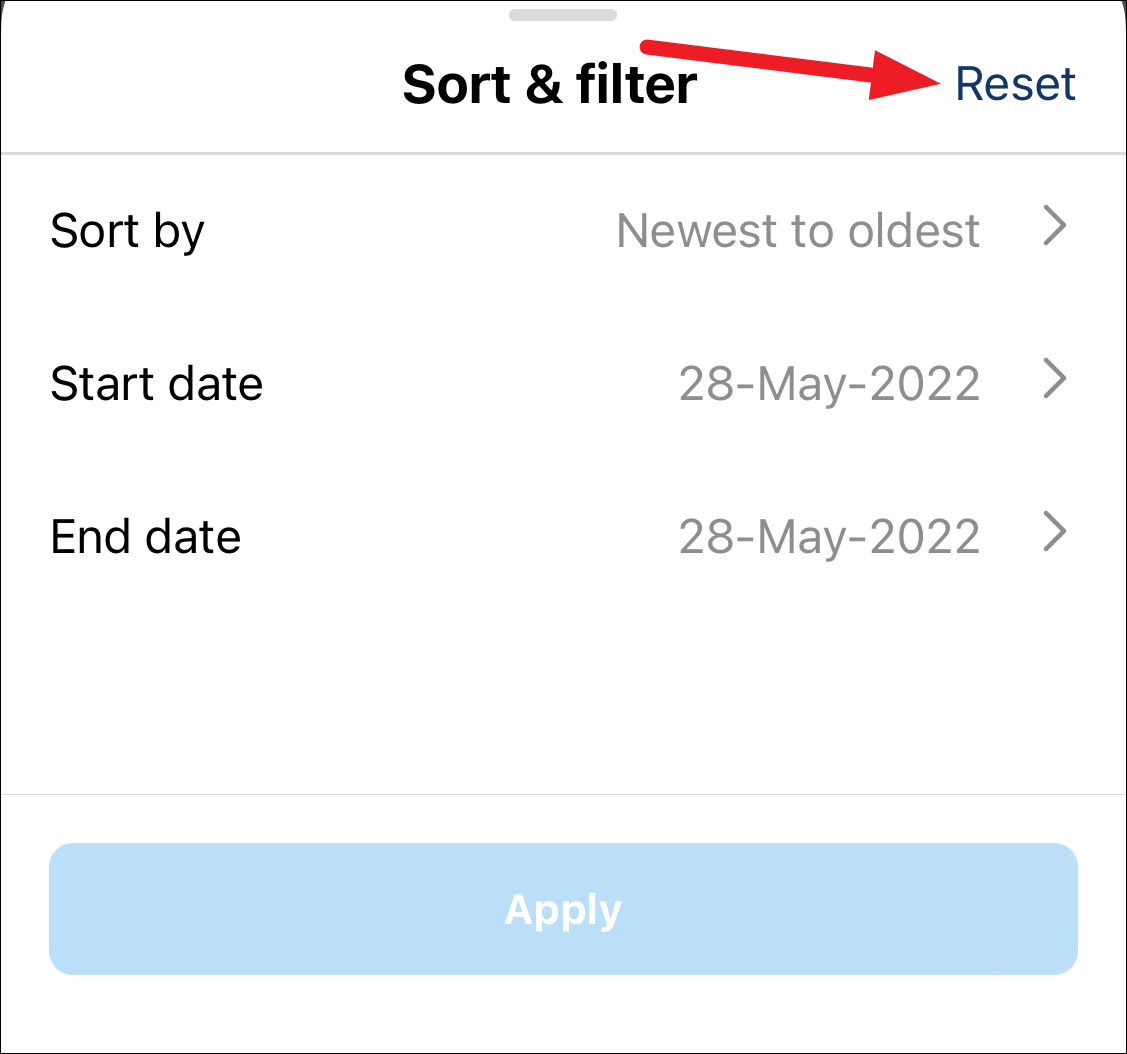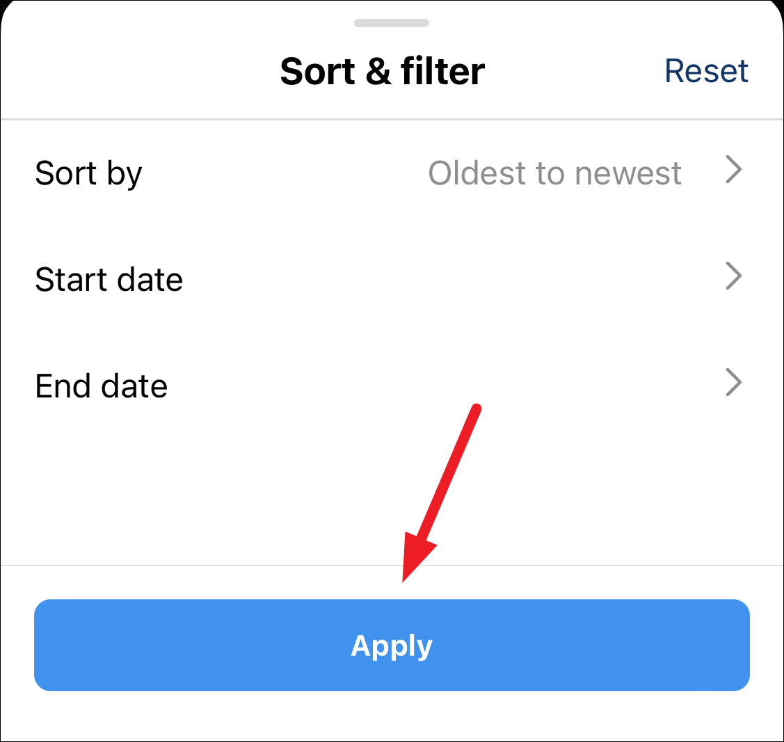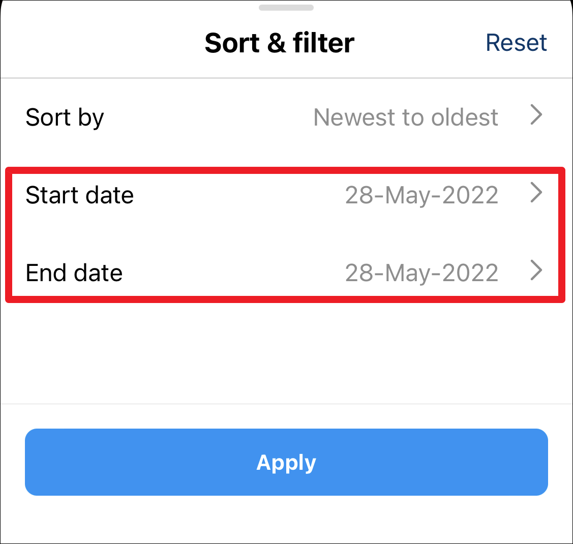 To view posts between certain dates, tap the options for ‘Start Date’ and ‘End Date’ respectively, and select the dates. Make both the dates the same if you only want to view the posts liked on a certain date. Then, tap ‘Apply’ to save the changes.