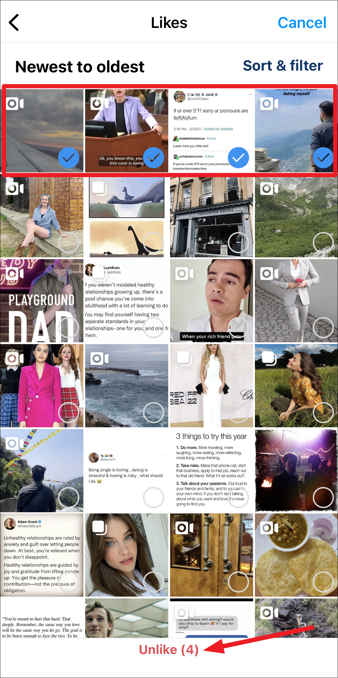 Then, tap the posts you want to unlike to select them. Finally, tap ‘Unlike’ at the bottom.