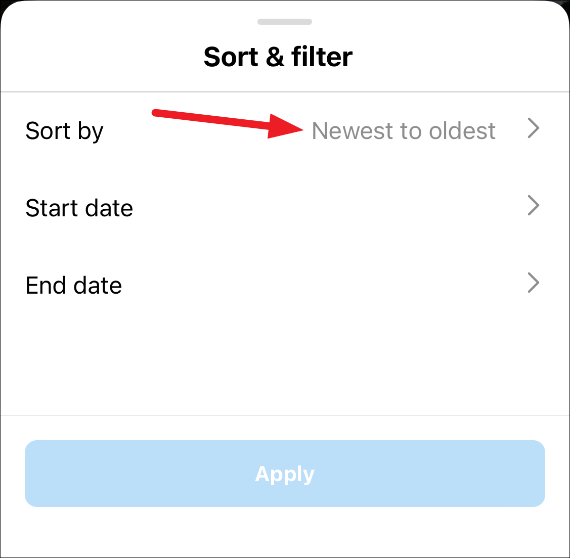 Options would appear on an overlay menu. To view your oldest liked posts, tap ‘Sort by’.
