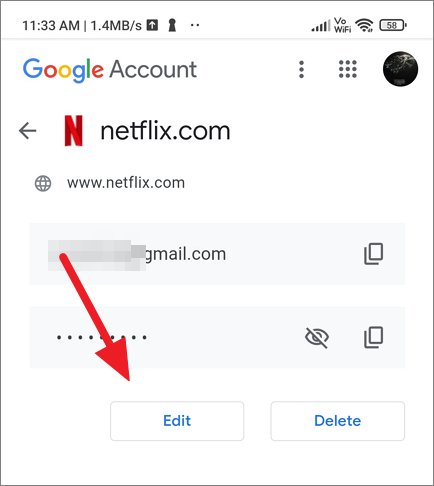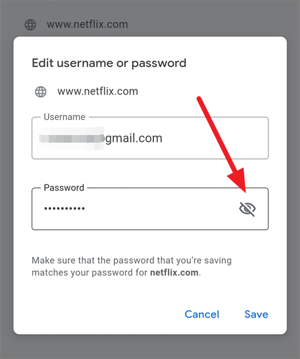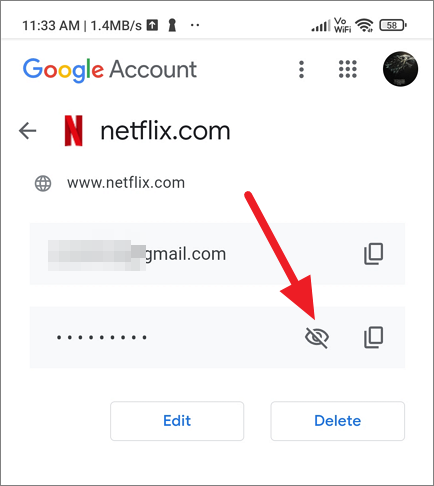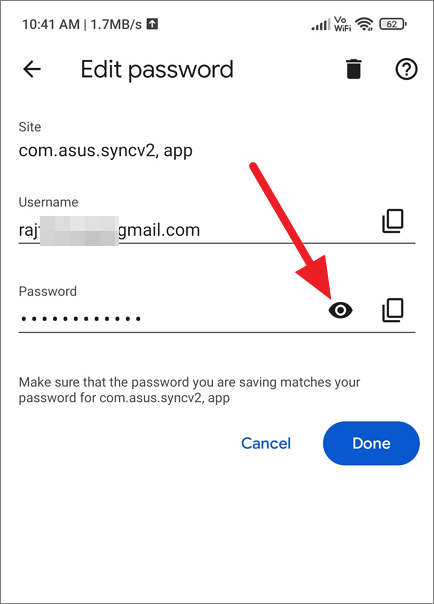This will open the Edit password page. Here, tap on the eye icon to view the hidden password.