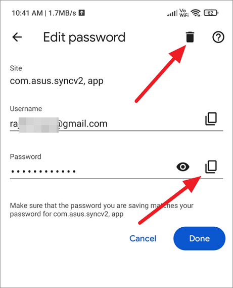 To copy the password, click the copy icon next to the eye icon. To delete this username and password from the list of saved passwords, click the trash icon above.