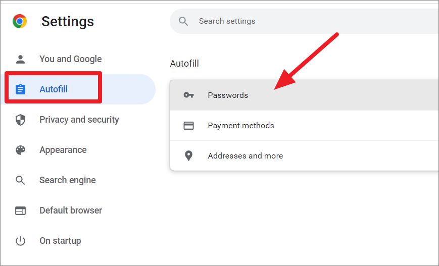On the Settings page, click on ‘Autofill’ on the left sidebar and select the ‘Passwords’ tile on the right sidebar.