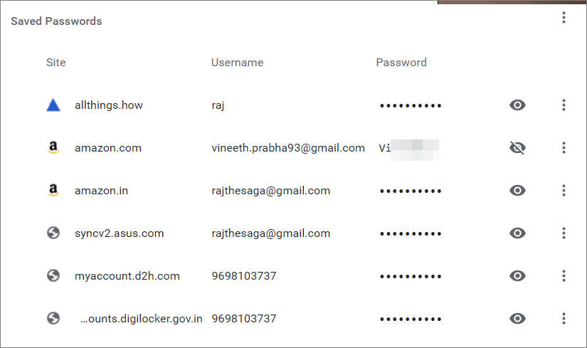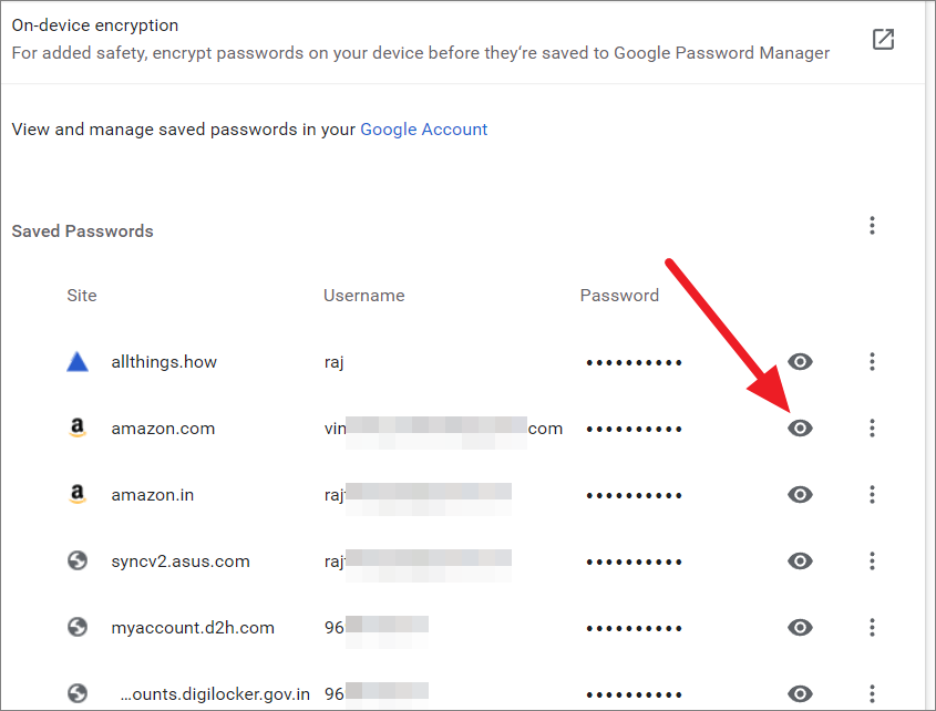 To see a password for a specific website, click the eye icon next to it.