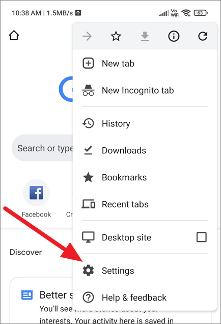 Launch the Chrome browser, click the three dots menu button and tap ‘Settings’.