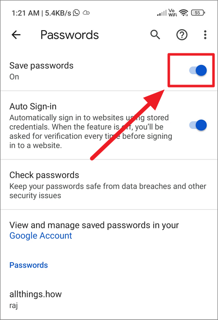 On the Passwords page, make sure the toggle next to ‘Save passwords’ is turned on.