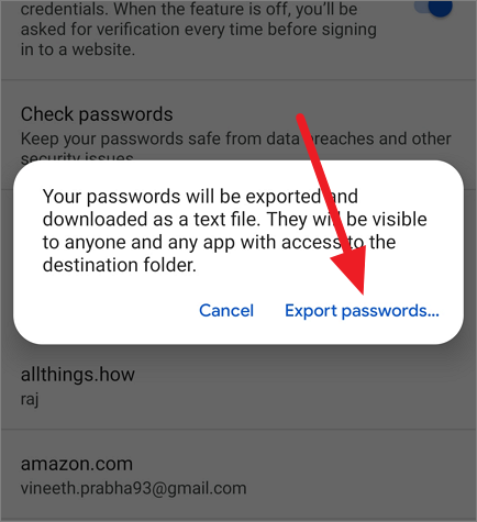 First, authenticate yourself using your device’s password, PIN, pattern, etc. Then, tap the ‘Export passwords…’ option again on the prompt that appears.