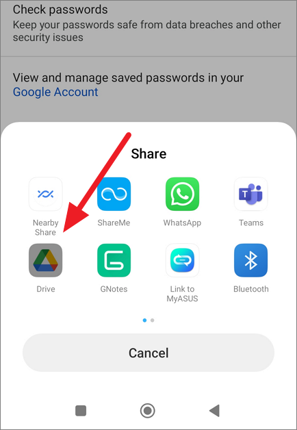 From the Share sheet, select an option to save and share the exported file. Here, we are choosing Google Drive.