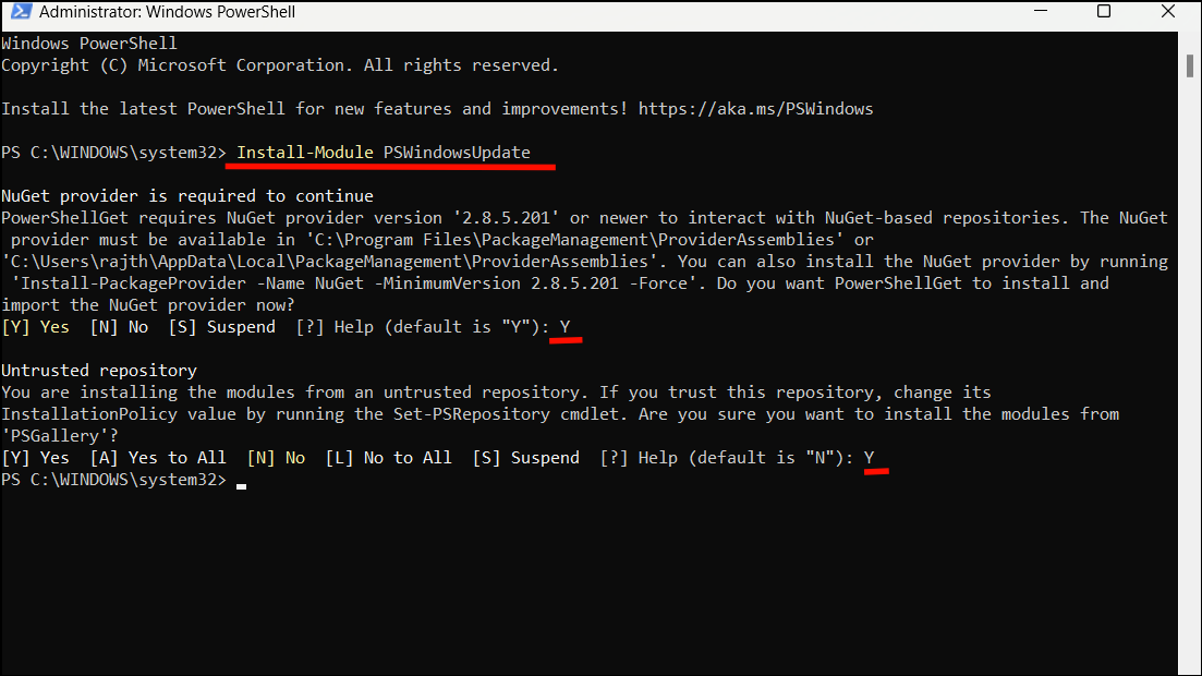 Install-Module PSWindowsUpdateIf prompted about the NuGet provider, type Y to confirm. If you receive a message about an untrusted repository, type A to proceed.