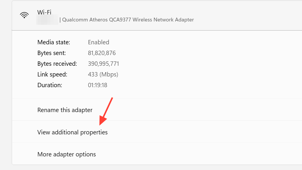 Step 1: With your Wi‑Fi adapter still selected in Advanced network settings, click View additional properties or a similarly named link under the adapter details. This opens the full properties view for that adapter.
