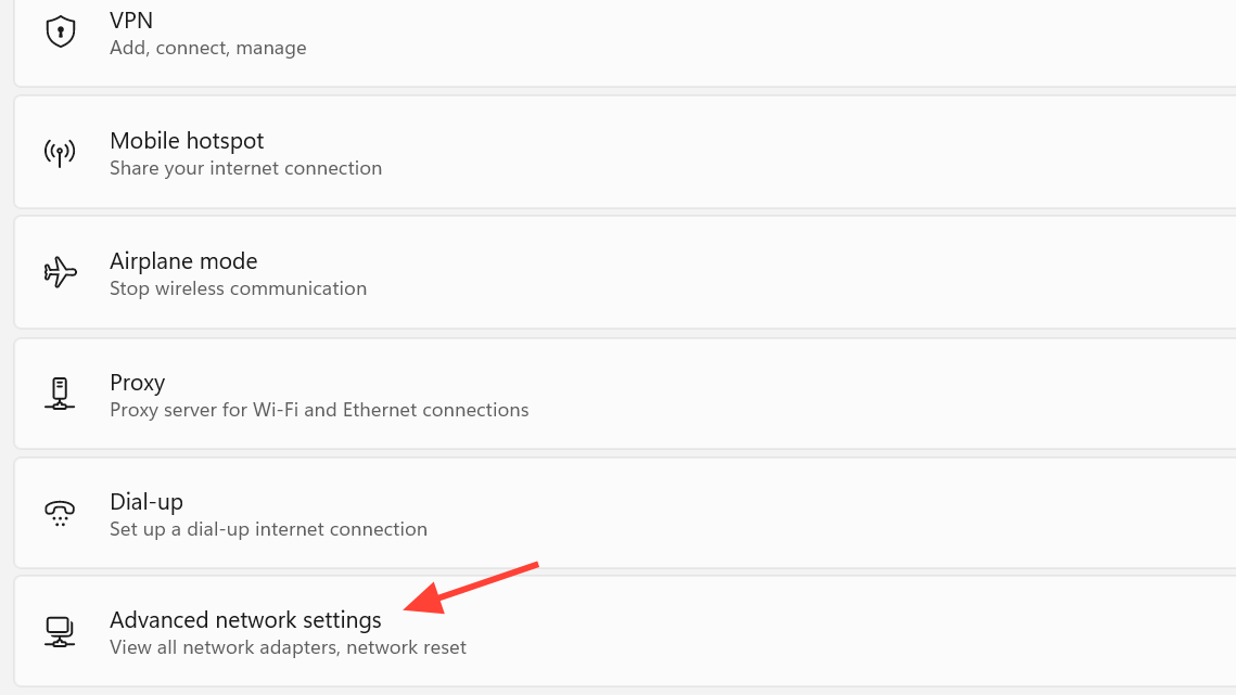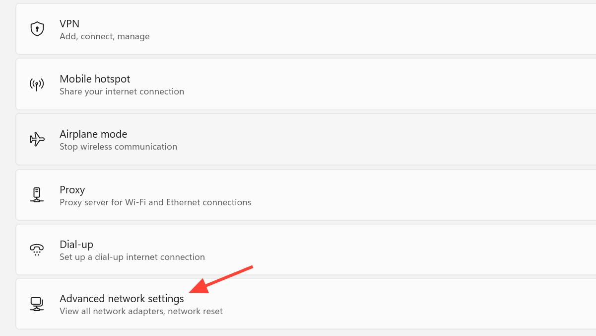 Step 3: Click Advanced network settings on the right side. This page shows every physical and virtual network adapter installed on the system.