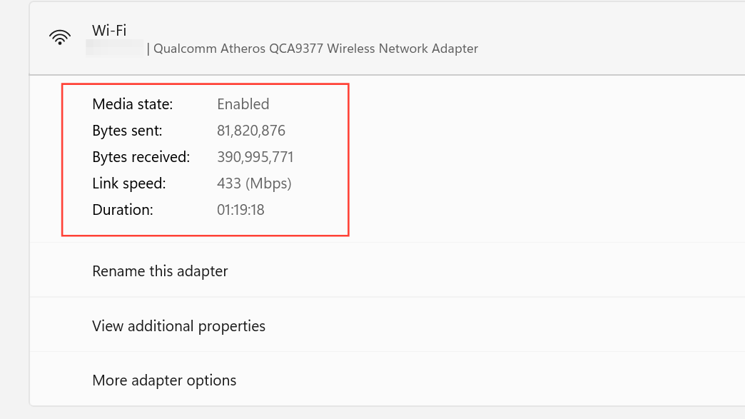 | Wi‑Fi adapter connection status and live counters. | Settings > Network & internet > Advanced network settings > select Wi‑Fi adapter. | Check media state, link speed, bytes sent and received, and connection duration. |