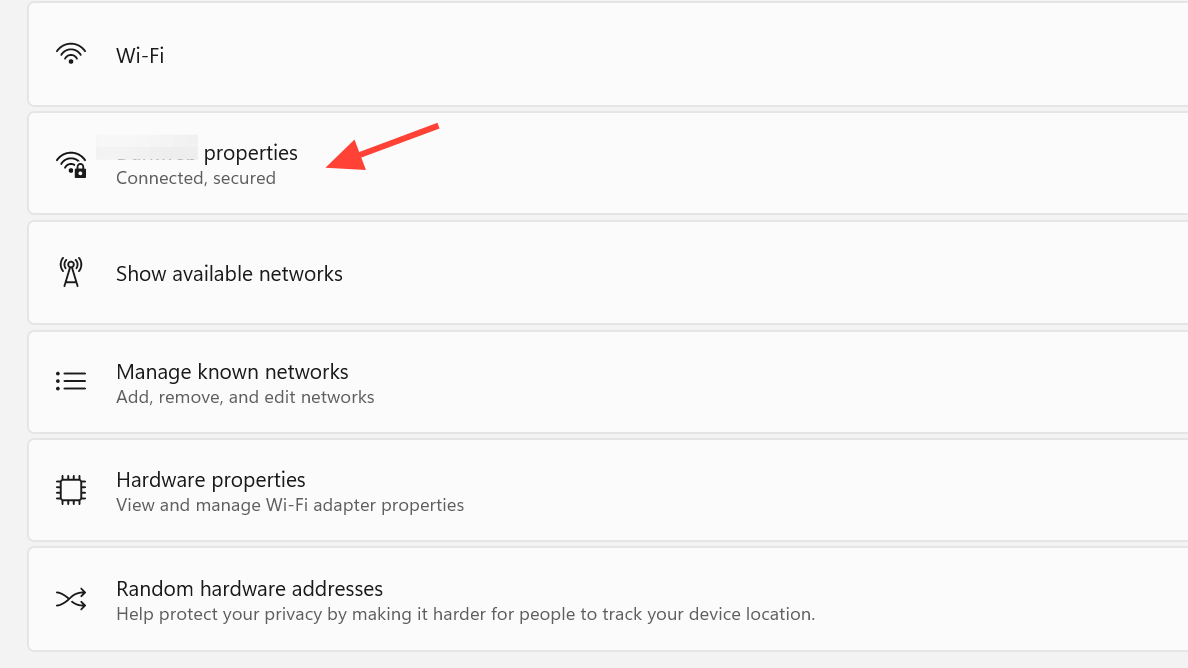 Step 3: If you are already connected to a network, click the line that shows the current Wi‑Fi network name and the word Connected. This opens the network’s properties.