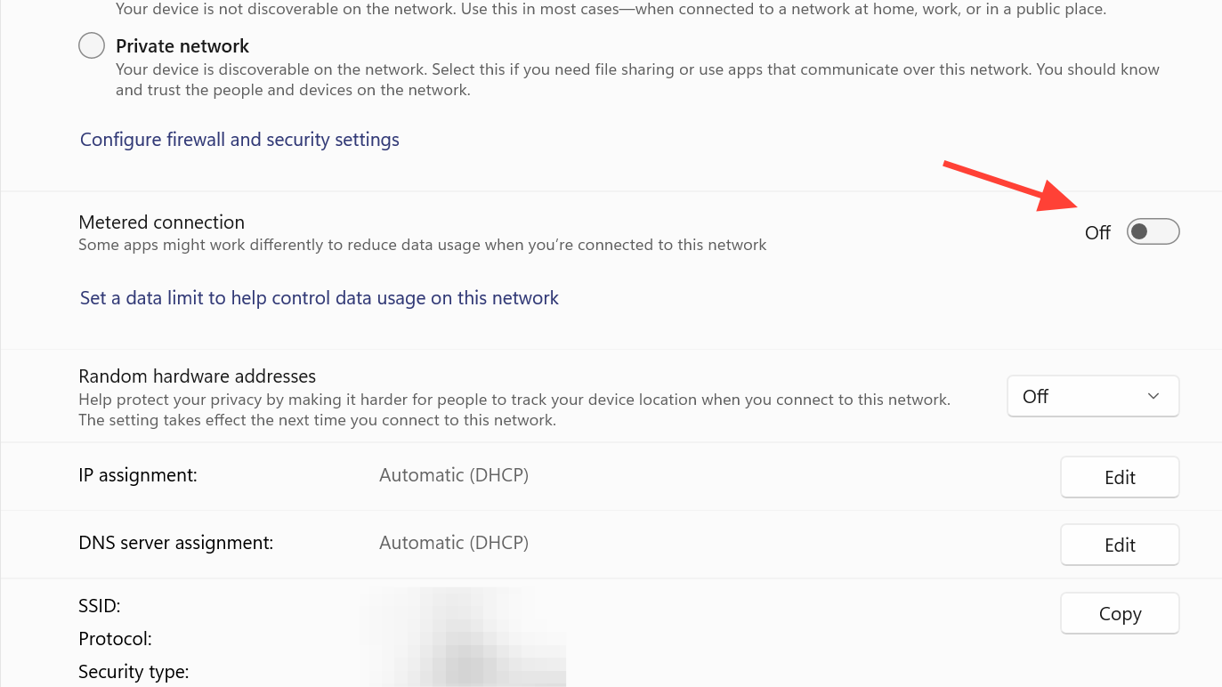 Step 5: Find the Metered connection setting and decide whether to turn it on. Metered mode tells Windows to reduce background data usage, which is helpful on limited data plans.