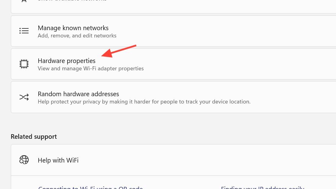 | Properties for all adapters (Wi‑Fi and Ethernet). | Settings > Network & internet > Advanced network settings > Hardware and connection properties. | Compare configuration across all network adapters in one list. |
