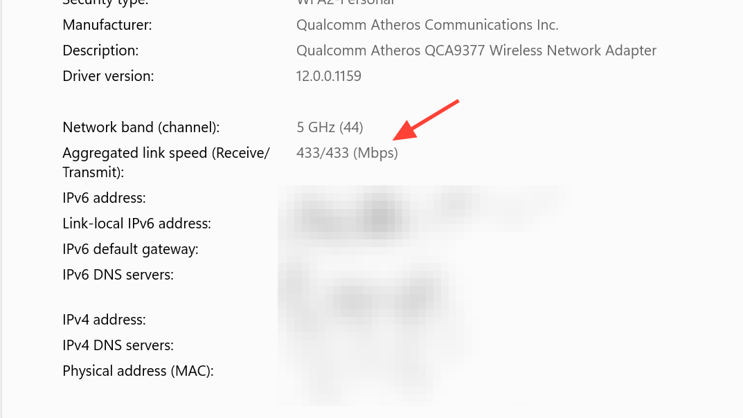Step 3: Look at the Link speed (receive/transmit) to see the negotiated speed between your PC and the Wi‑Fi router. Lower than expected speeds can explain slow transfers.