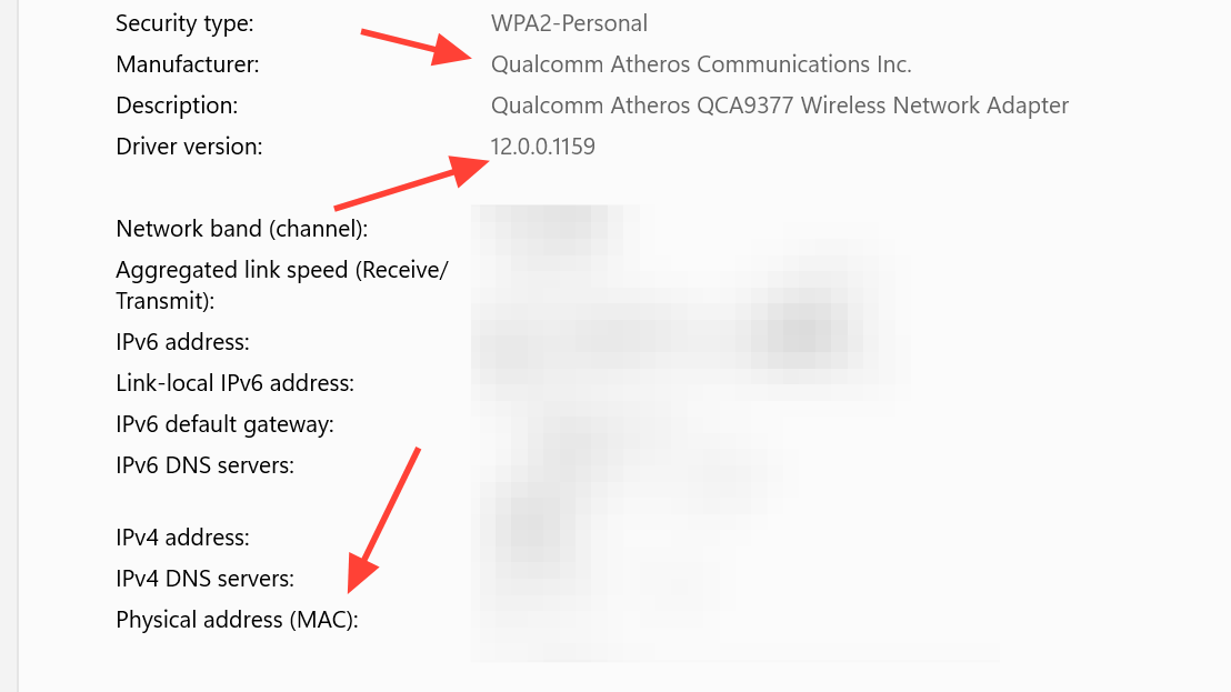 Step 5: Locate the Physical address (MAC), Manufacturer, and Driver version lines. These values help when updating drivers or identifying the adapter during troubleshooting.