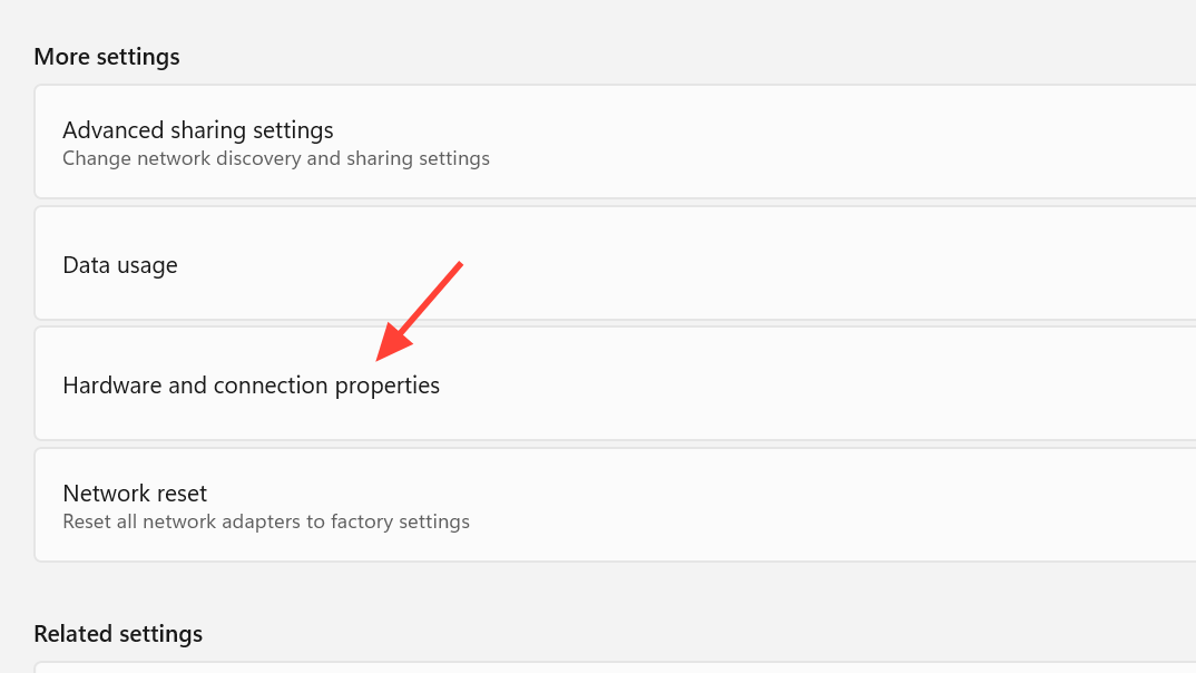 Step 3: Under More settings, choose Hardware and connection properties. This opens a consolidated list of all adapters.