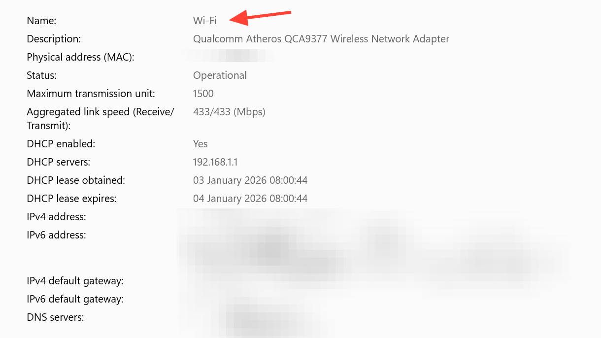 Step 5: Compare values between adapters if your device has both Wi‑Fi and Ethernet. For example, you can confirm which adapter is getting which IP range and DNS servers.