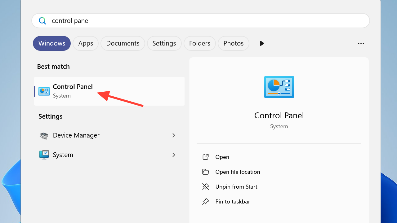Step 1: Open the Start menu and type control panel, then select the Control Panel desktop app. This opens the legacy configuration environment.