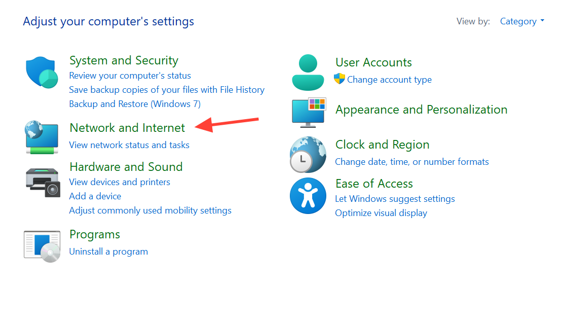 Step 2: Click the Network and Internet category. This groups together network‑related classic tools.