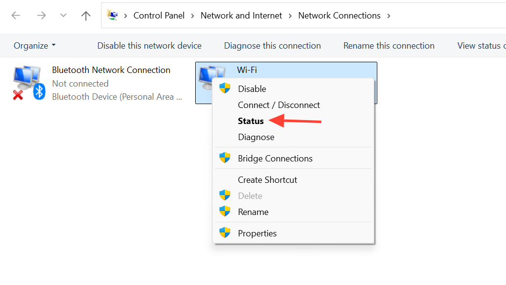 Step 6: Right‑click the Wi‑Fi adapter and choose Status to see connection duration, speed, and activity, or click Properties to manage protocols and advanced options.