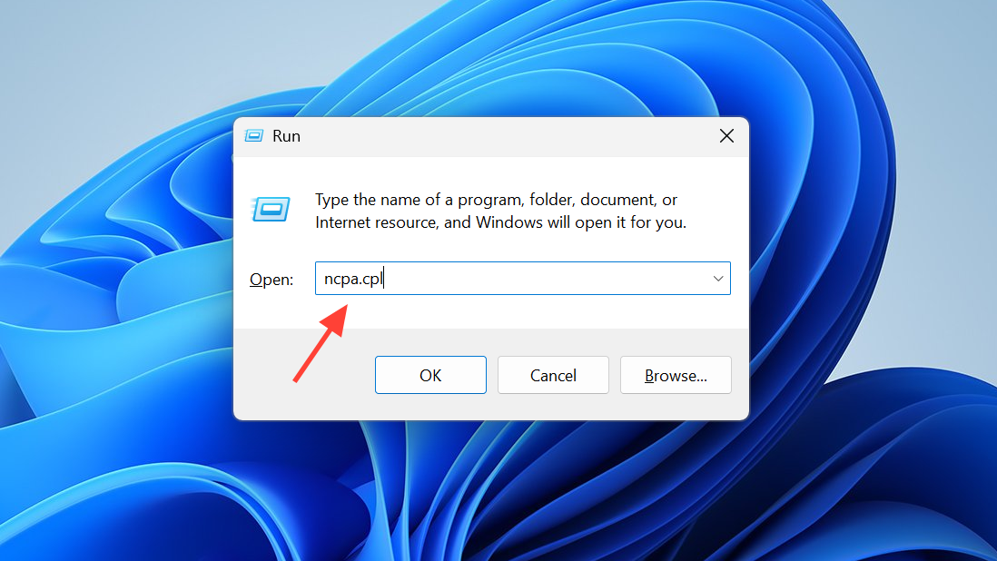Step 2: Type ncpa.cpl and press Enter. Windows opens the Network Connections window directly.