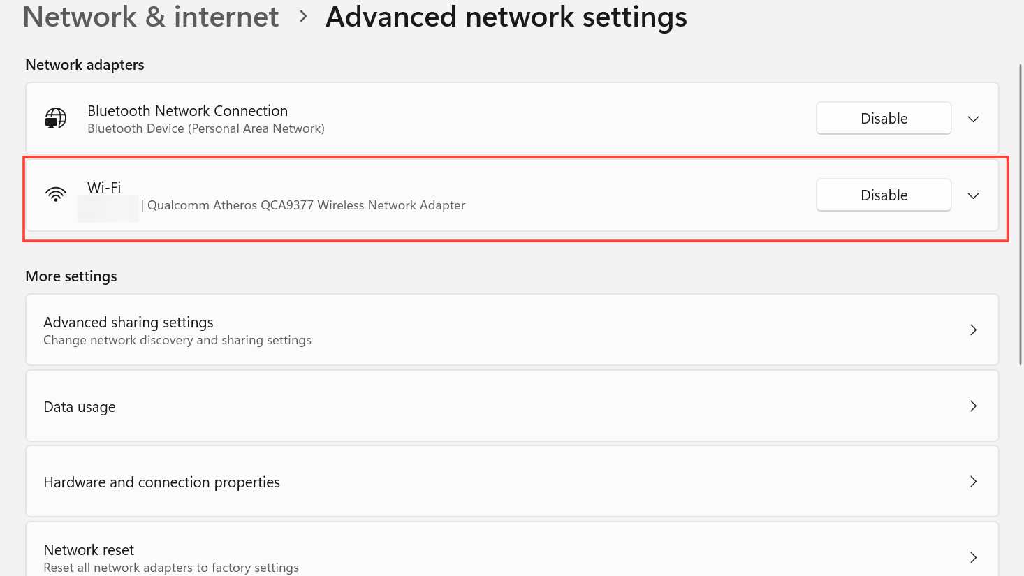 Step 2: Review the Wi‑Fi adapter icon. If it appears greyed out and labeled Disabled, it is turned off.