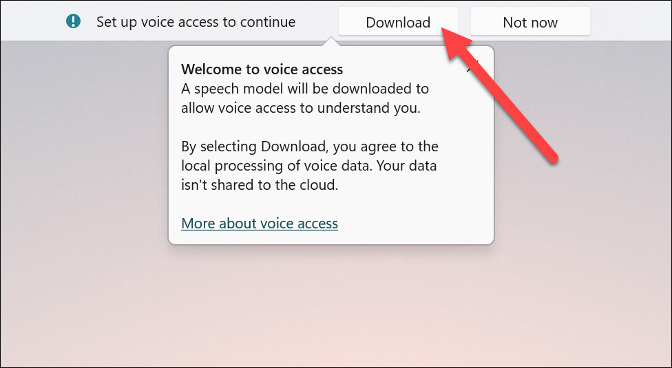 Step 6: When you enable Voice Access for the first time, you'll be prompted to download a speech model. Click on the Download button in the Voice Access banner at the top of your screen.