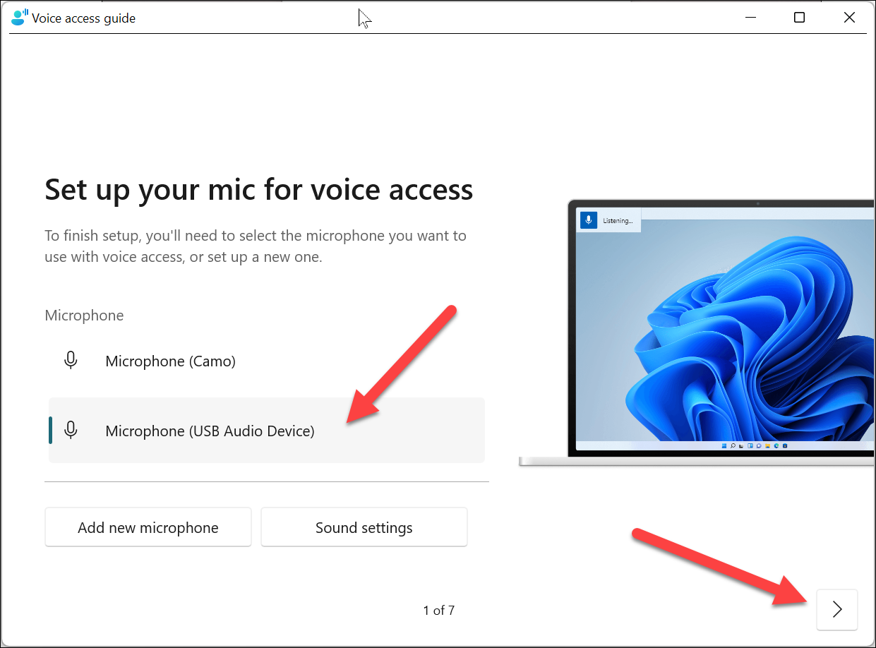 Step 7: After the download, the Voice Access guide will appear. Under the Microphone section, select your preferred microphone from the list or choose to Add new microphone. Click the arrow at the bottom right to continue.