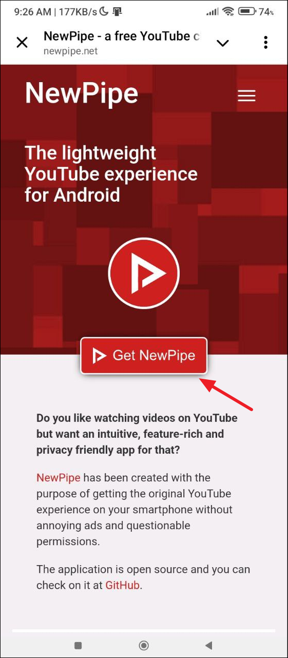 - Visit the NewPipe website and tap on the 'Get NewPipe' button.