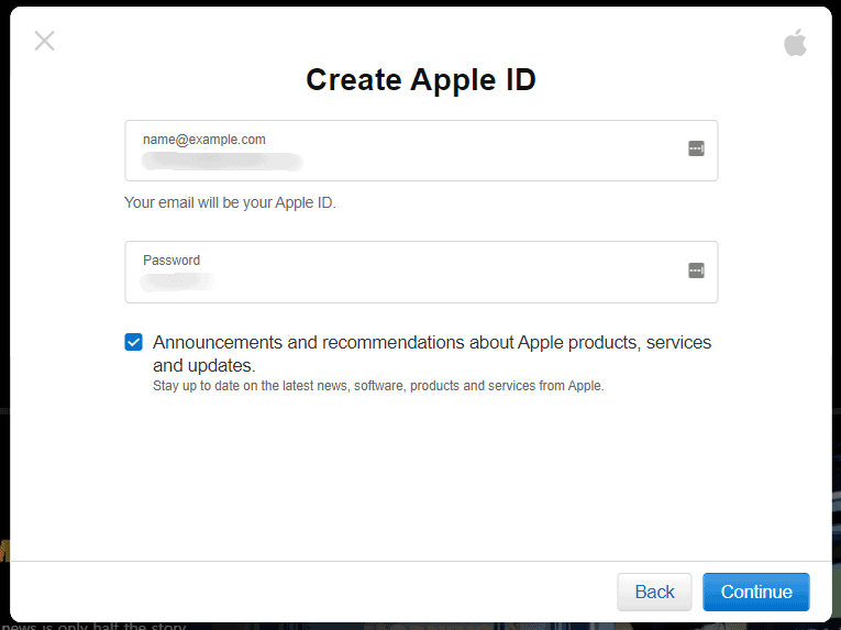 Finally, fill in your email address and a password you wish to set for your Apple ID. Remember, the email address you type in here will also be your Apple ID. Hit the “Continue” button after filling in the details.