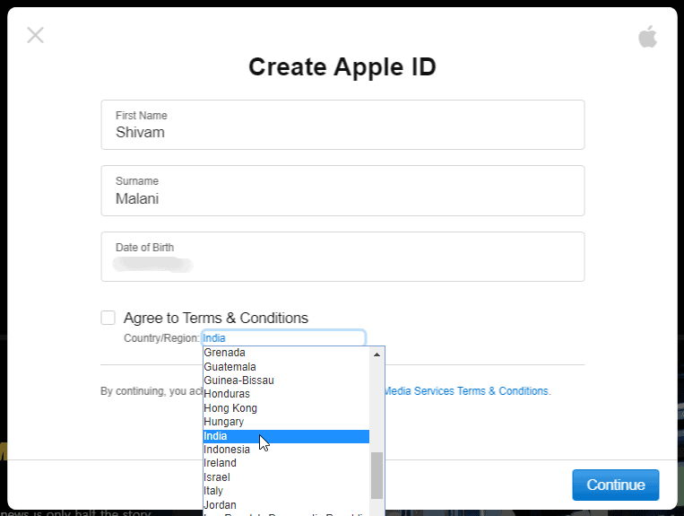 On the next screen, you’ll get a form to create an Apple ID. Fill in your “Name” and “Birthday”, and agree to “Terms & Conditions”. Be sure to change the country from “United States” to your country if you’re not a US resident. Hit the “Continue” button after filling the form.