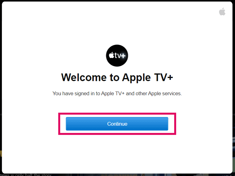 If you get a “Confirm subscription” pop-up, click “Confirm” again. Then you’ll get the “Welcome to TV+” screen, hit the “Continue” button.