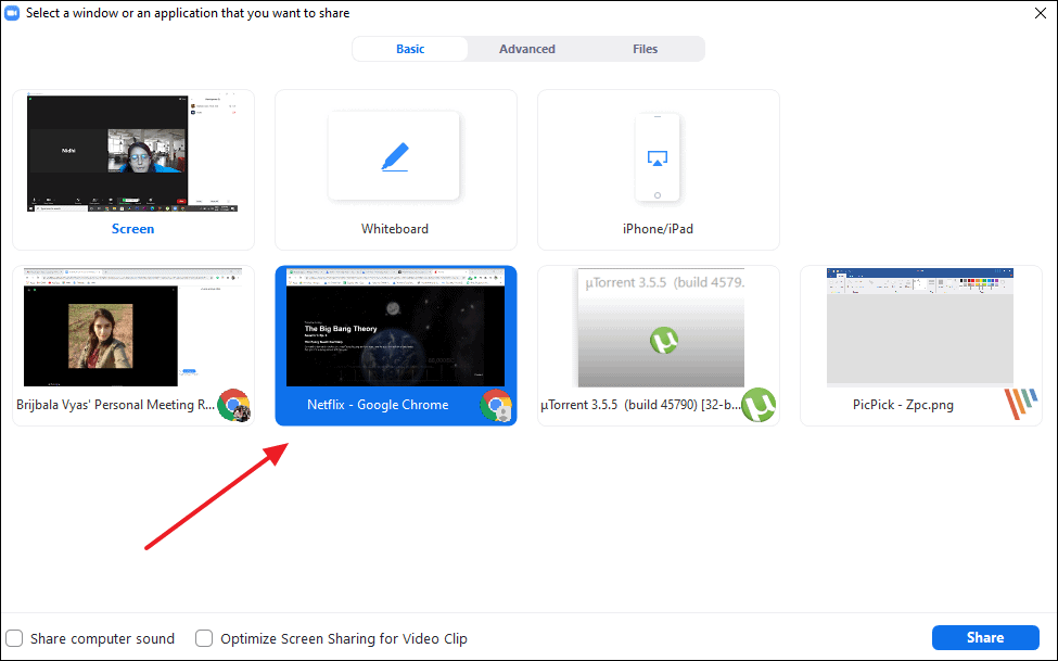 On clicking the screen share button, a new window will open. Options of all the windows open on your desktop will be available on it to choose from. Select the Netflix app window or the browser tab in order to share it with your fellow meeting participant.