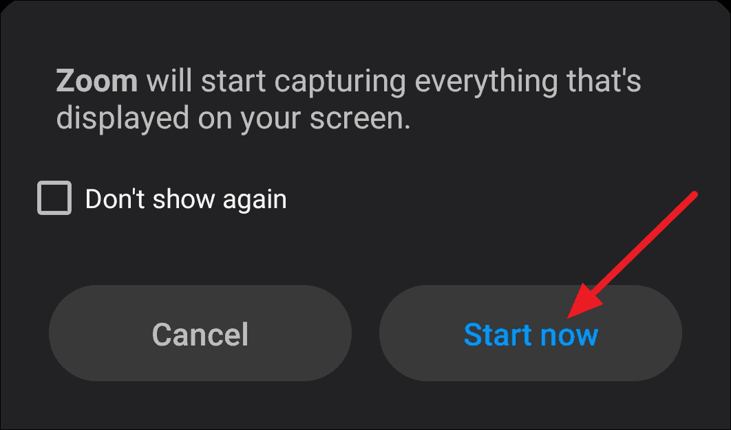 Zoom will then display a notification informing you that it will start capturing everything that will display on your screen from now on. Select ‘Start Now’ to proceed further.