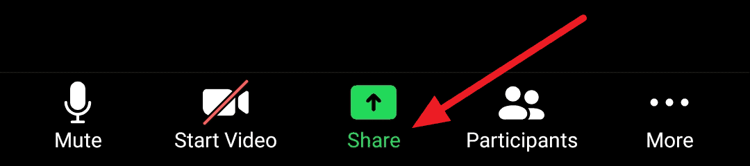The first thing you need to do is start a meeting on your Zoom mobile app with people you wish to share Netflix with. On the bottom panel of the call screen, you will see the ‘Share’ button at the center. Click on it.