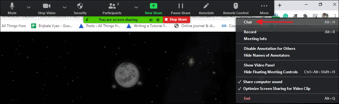 At the top of your Netflix screen, you will also have the option to mute your microphone, stop your camera, stop or pause screen sharing, etc on a narrow panel. On clicking upon the ‘More’ button on the panel, you will get the expanded menu with options to chat with other participants while viewing Netflix, record the whole session, and much more. By using the chat option, you can have a complete experience of online co-streaming on Zoom as you can always converse with fellow participants at the same time.