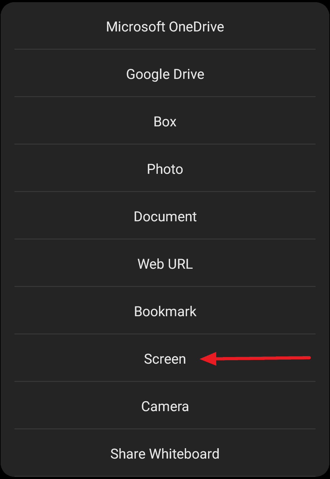 On clicking the Share button, a new pop-up window will appear on your screen. Several options will be listed there among which you can choose to share through this feature. Select ‘Screen’ from that list.